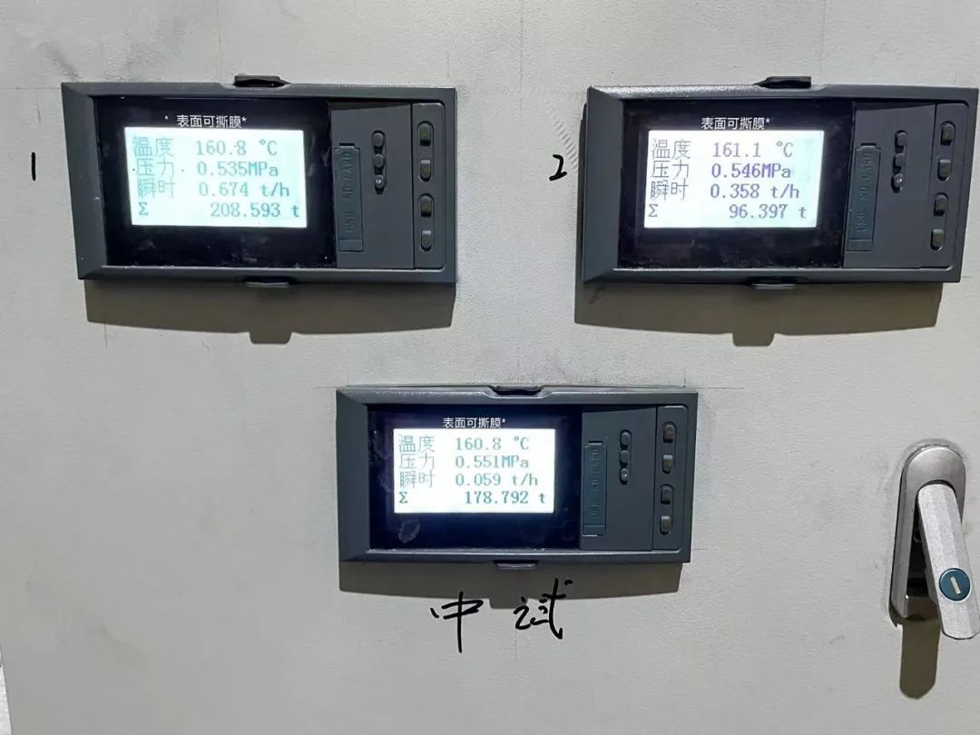 此外,工況現場采用了分體式安裝的形式,通過安裝于多個管道間,同一管路上的渦街流量計、壓力變送器、溫度傳感器采集流量、壓力、溫度信號,并通過信號傳輸,將多個位置蒸汽參數集中顯示在機柜內的流量積算儀中,在確保了計量精準的同時,也能便于現場工人參數設置及抄表維護。