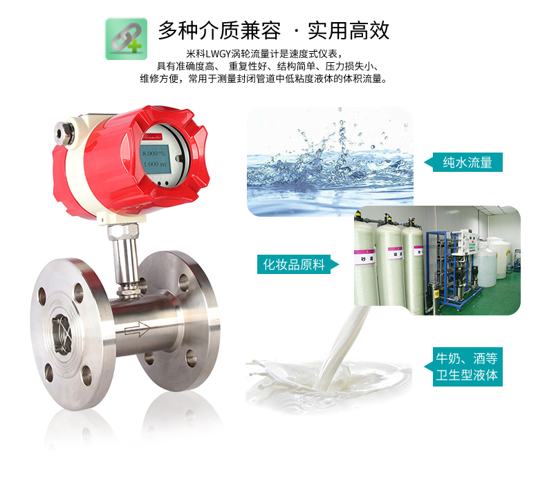 LWGY-MIK系列液體渦輪流量計是一種速度式儀表,它具有準確度高、重復性好、結構簡單、壓力損失小、維修方便等優點,用于測量封閉管道中低粘度液體的體積流量。在石油、化工、冶金、供水、造紙等行業中具有廣泛的應用。