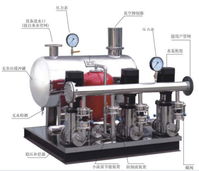 1、恒壓供水技術相比調節閥門的控制水泵出口壓力的方式,具有降低管道阻力大大減少截流損失的效能。