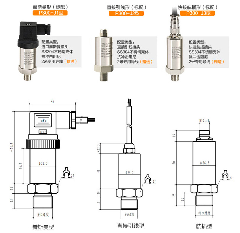 MIK-P300系列壓力變送器壓力敏感核心采用了高性能的進口硅壓阻式壓力充油芯體,內部的專用集成電路將傳感器毫伏信號轉換成標準電壓、電流或頻率信號,可以直接與計算機電路接口卡、控制儀表、智能儀表、PLC等方便相連。遠距離傳輸可以采用電流輸出方式。具有體積小、重量輕、全不銹鋼密封結構等特點,可在腐蝕性環境中工作。該產品安裝方便簡潔,具有高抗震和抗沖擊性能。